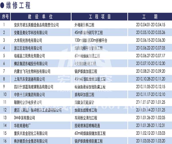 宏順建設工程有限公司是國家批準成立的專業高空作業企業:承攬過(國內.國外)煙囪新建、煙囪防腐、吊機防腐、水塔防腐、管道防腐、龍門吊防腐、儲存罐防腐、煙囪內壁防腐等高空作業工程。具有“不搭腳手架 、 不需要停產”施工特點。